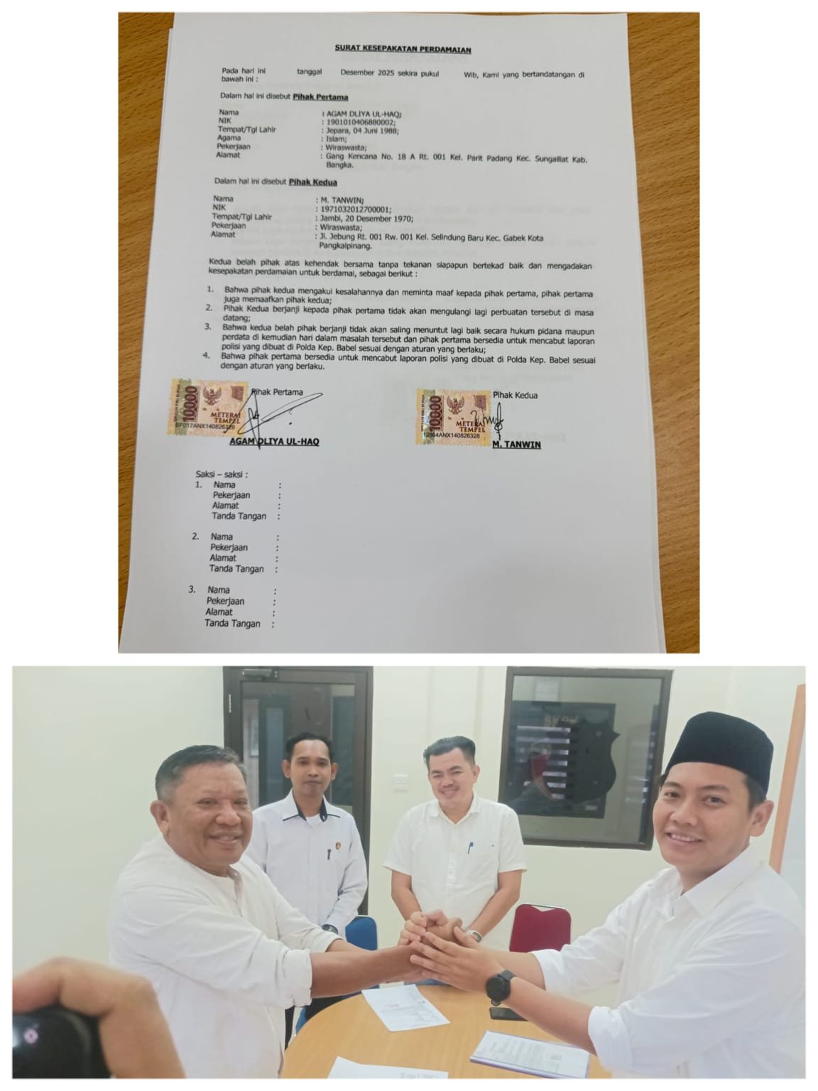 AGAM DLIYA UL-HAQ dan M. TANWIN resmi menandatangani Surat Kesepakatan Perdamaian pada Desember 2025 sebagai bentuk itikad baik kedua belah pihak untuk mengakhiri persoalan yang terjadi.