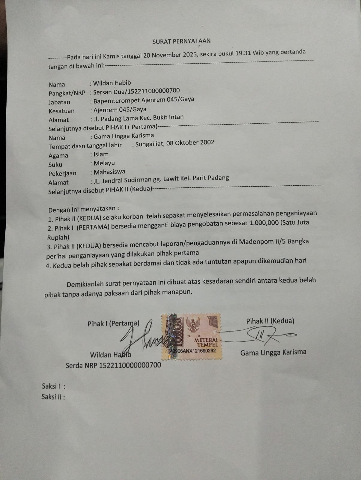 Dalam pernyataan itu, pihak pertama, Wildan Habib—yang berstatus Sersan Dua Ajenrem 045/Gaya—dan pihak kedua, Gama Lingga Karisma, selaku korban, menyepakati empat poin utama.