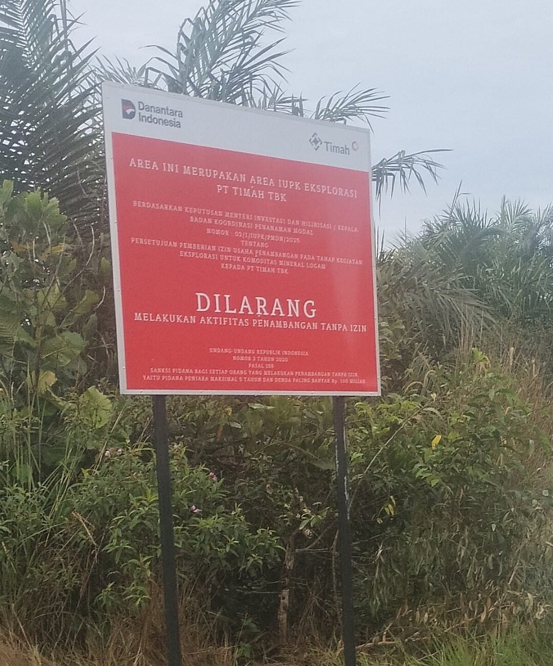 Di lokasi tambang, papan peringatan milik PT Timah Tbk terpancang jelas. Tulisan besar berbunyi ancaman pidana bagi pelanggar, lengkap dengan logo perusahaan. Namun papan itu kini hanya menjadi hiasan hukum tanpa daya.