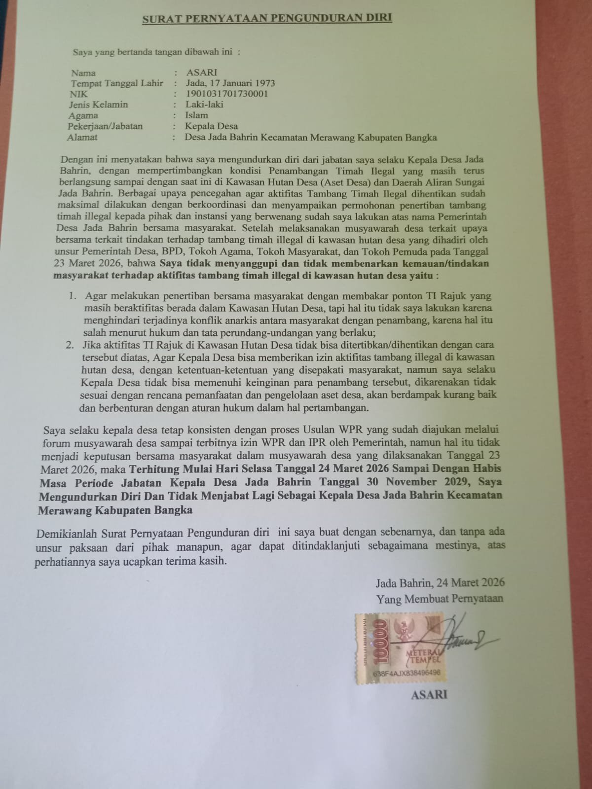 Surat pengunduran diri tersebut dibuat pada 24 Maret 2026 dan berlaku sejak tanggal yang sama hingga akhir masa jabatannya pada 30 November 2029. Dalam pernyataannya, ASARI menegaskan bahwa keputusan itu diambil tanpa paksaan, melainkan sebagai bentuk sikap tegas atas prinsip hukum dan upaya menjaga kelestarian lingkungan desa.