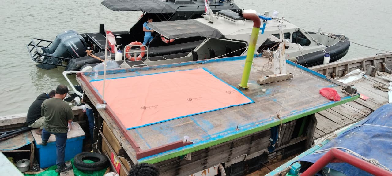 Kedua kapal patroli itu tampak bersandar di sisi KM Murah Rezeki yang tengah diamankan.
