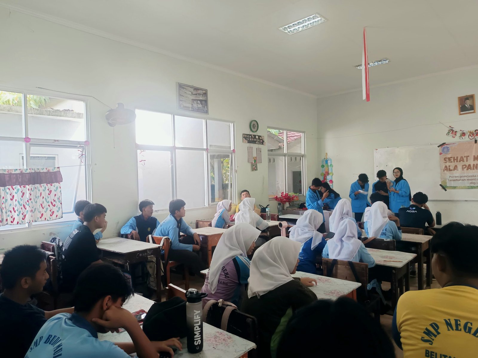 Kegiatan dimulai dengan pembukaan, dilanjutkan penyampaian materi tentang pentingnya menjaga kesehatan mental di tengah perkembangan teknologi yang pesat. Mahasiswa menghadirkan beragam media edukasi seperti spanduk dan visual interaktif untuk memudahkan pemahaman siswa. Suasana menjadi lebih hidup dengan permainan “Tebak Gaya” yang melibatkan seluruh peserta agar pesan yang disampaikan tidak membosankan.