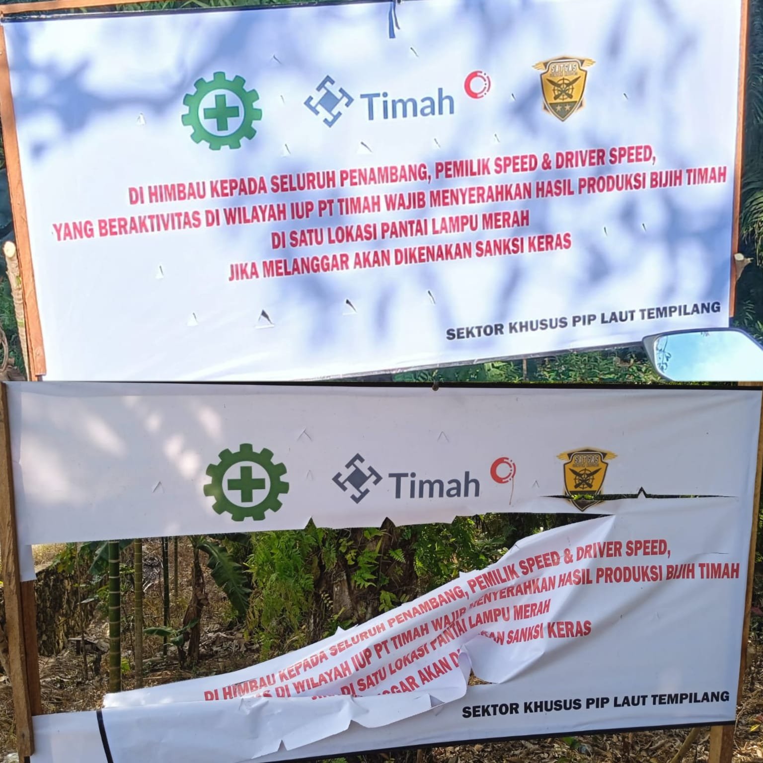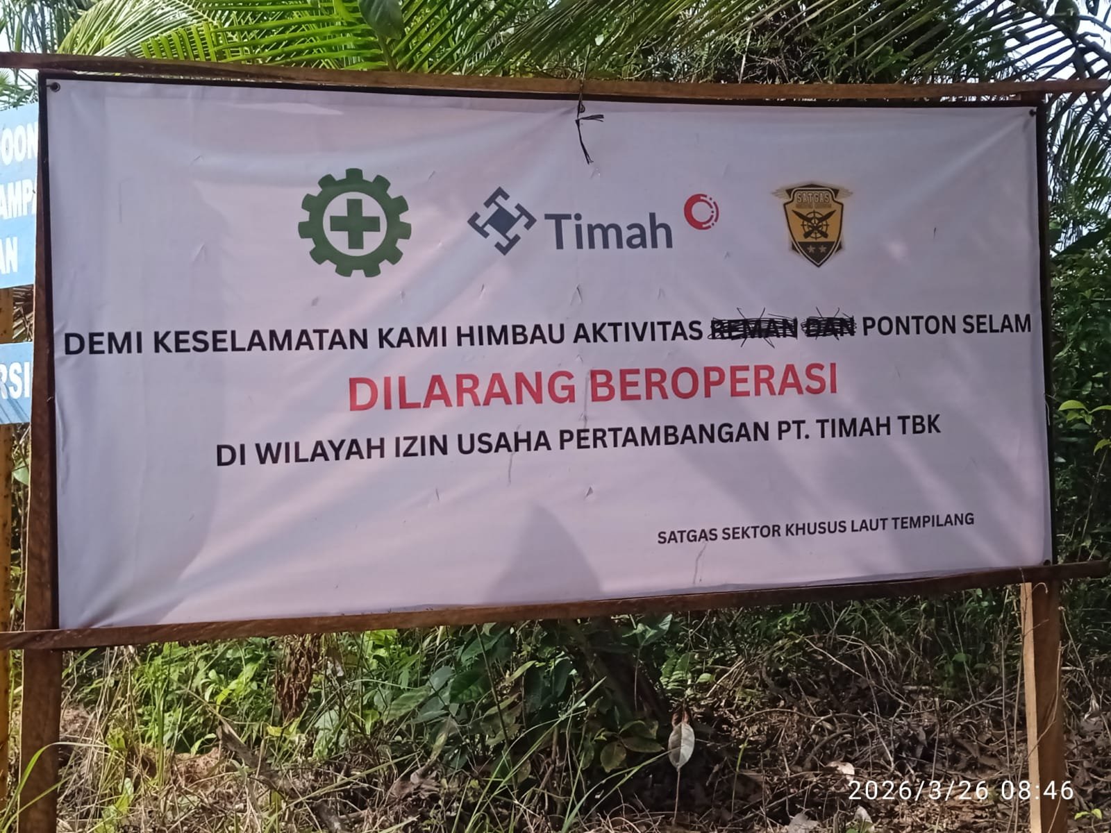 “DEMI KESELAMATAN KAMI HIMBAU AKTIVITAS PENAMBANGAN DAN PONTON SELAM DILARANG BEROPERASI DI WILAYAH IZIN USAHA PERTAMBANGAN PT TIMAH TBK”
