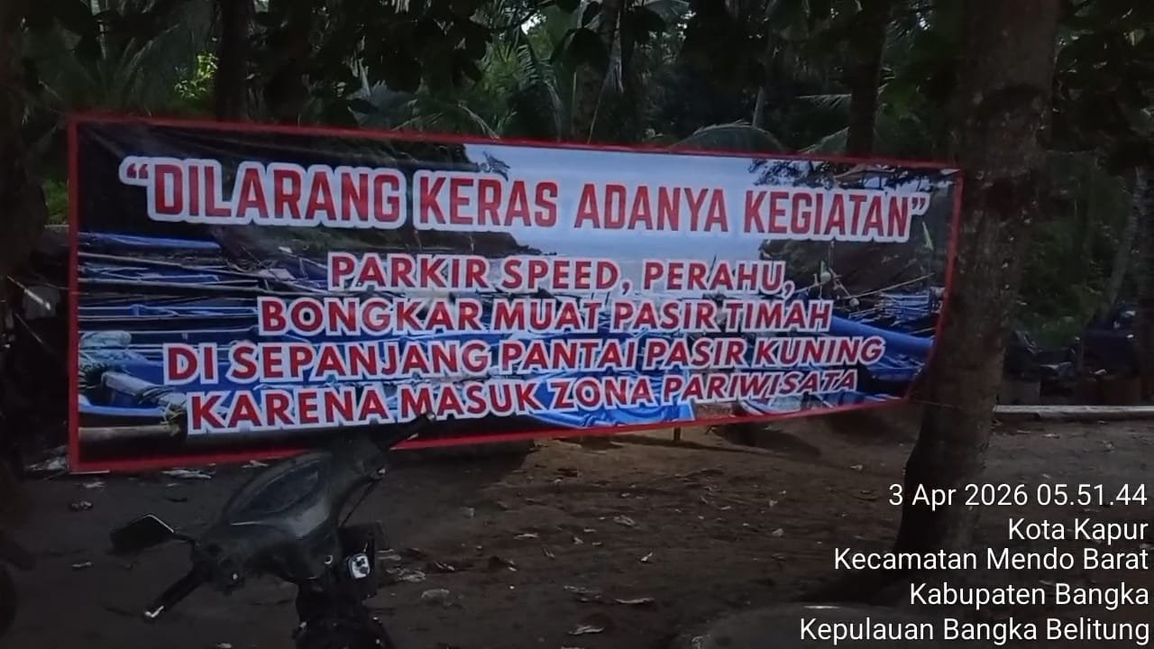 “DILARANG KERAS ADANYA KEGIATAN PARKIR SPEED, PERAHU, BONGKAR MUAT PASIR TIMAH DI SEPANJANG PANTAI PASIR KUNING KARENA MASUK ZONA PARIWISATA”