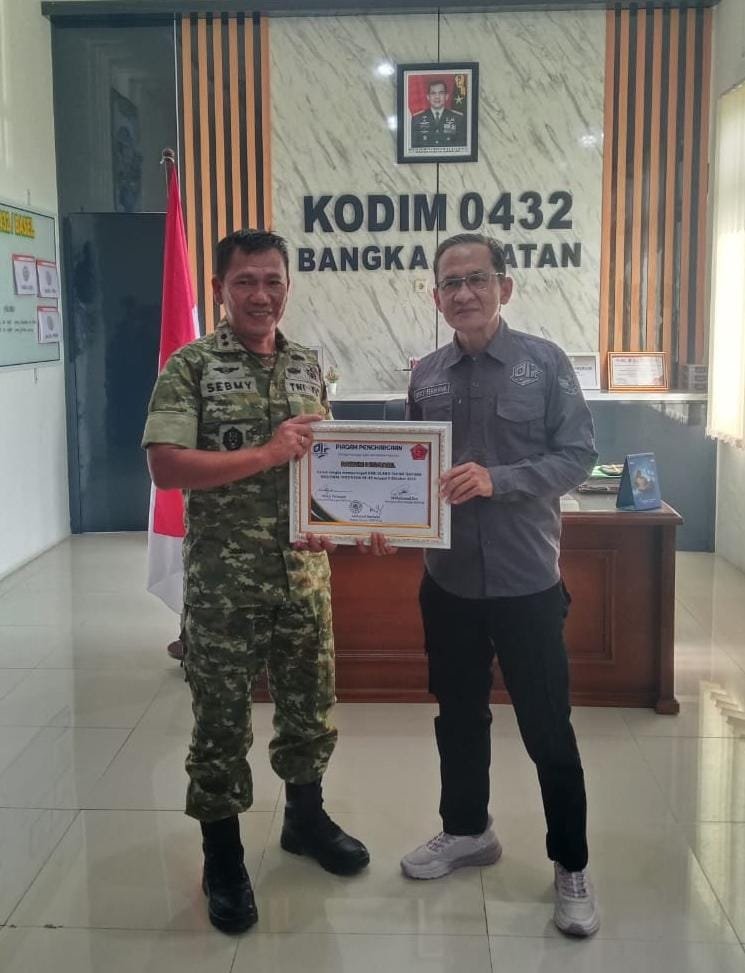 KBOBABEL.COM (PANGKALPINANG) — Seusai memberikan piagam penghargaan kepada Batalyon Infanteri 147/Ksatria Garuda Jaya (Yonif 147/KGJ), jajaran pengurus Pro Jurnalismedia Siber (PJS) Provinsi Kepulauan Bangka Belitung melanjutkan kunjungan silaturahmi ke Komando Distrik Militer (Kodim) 0432/Bangka Selatan. Kamis (9/10/2025).