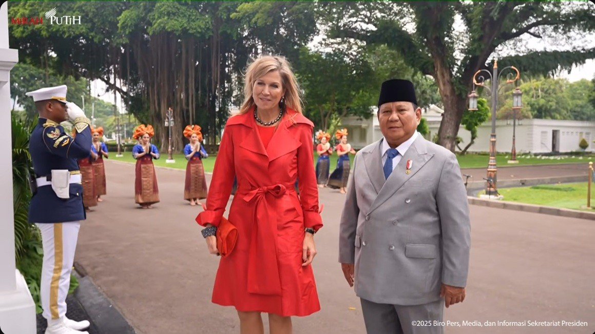 Dari Pantauan, Ratu Maxima tiba di Istana Merdeka dengan mengenakan busana merah elegan. Sesampainya di halaman depan istana, ia disambut langsung oleh Presiden Prabowo. Penyambutan tersebut turut dimeriahkan penampilan tari Indang, seni tari tradisional dari Sumatera Barat, yang menghadirkan nuansa budaya Indonesia dalam suasana kenegaraan yang hangat.