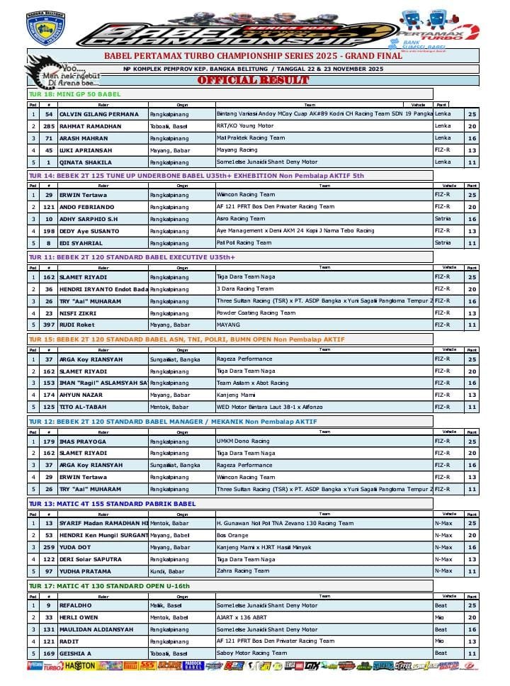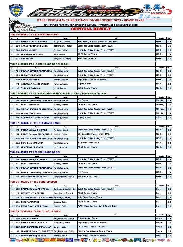 KBOBABEL.COM (Bangka Belitung) — Gelaran Grand Final Babel Turbo Championship 2025 kembali melahirkan cerita manis bagi pembalap lokal. Putra Novendra, rider asal Sungailiat, Bangka, sukses mempertahankan gelar Juara Umum pada kejuaraan bergengsi yang digelar selama dua hari, 22–23 November 2025, di Circuit Non Permanen Kompleks Perkantoran Provinsi Babel. Senin (24/11/2025).