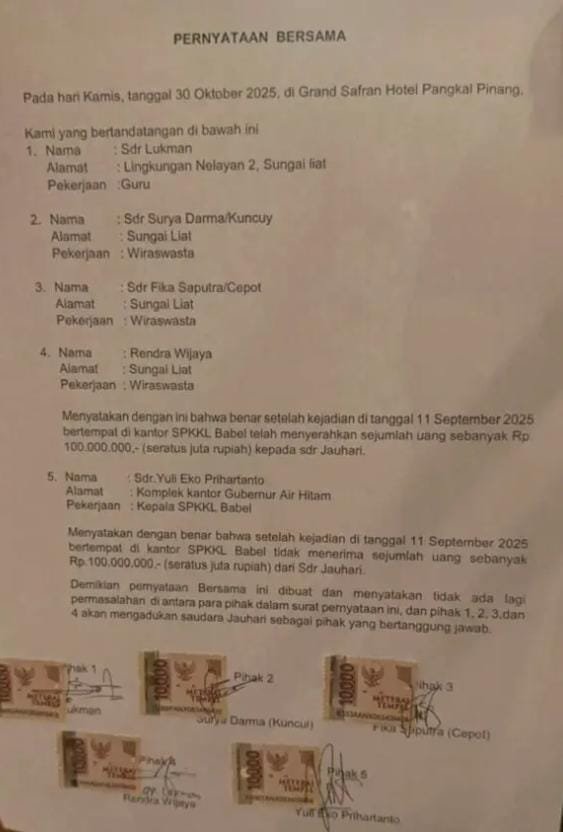Ketiga nama di atas tersebut (Lukman, Kuncui & Rendra Wijaya) dalam surat pernyataan bersama yang ditandatangani di Grand Safran hotel, jalan Soekarno Hatta Kota Pangkal Pinang berisikan jika ketiganya mengakui telah menyerahkan uang senilai Rp 100.000,- setelah kejadian tanggal 11 September 2025 kepada seorang oknum berinisial Joh (stafsus Gubernur Babel).